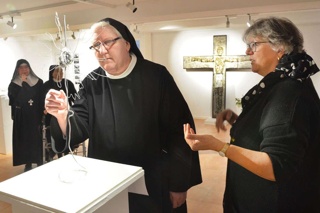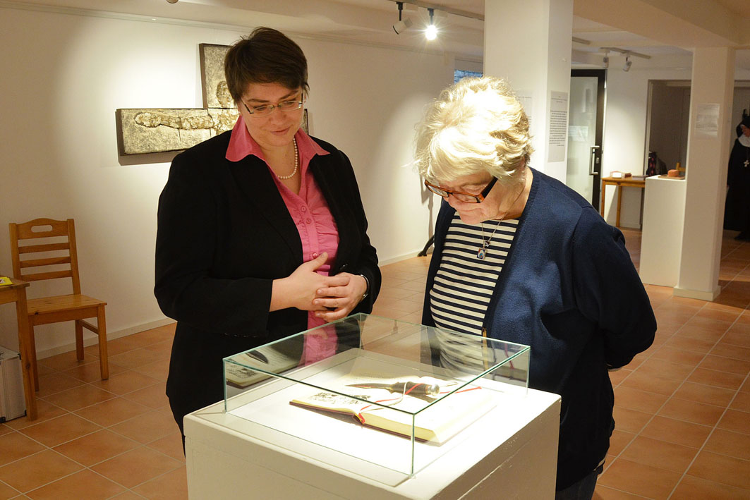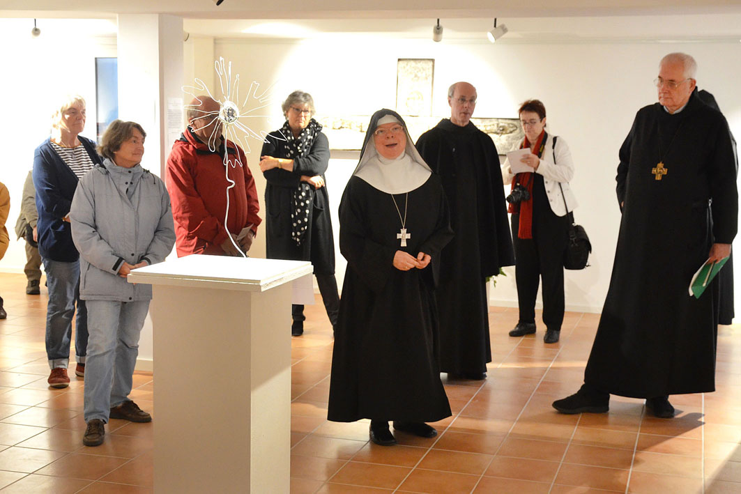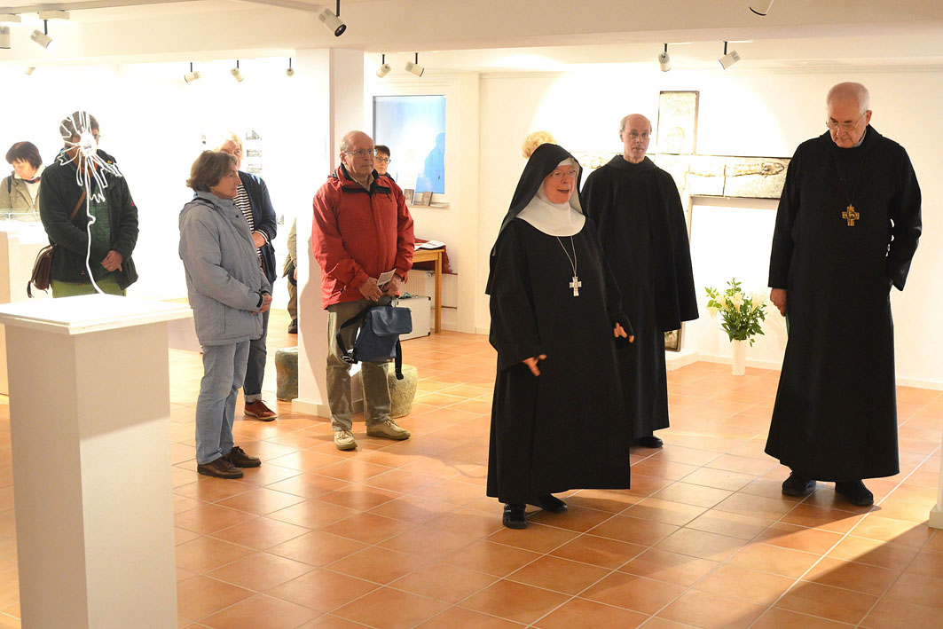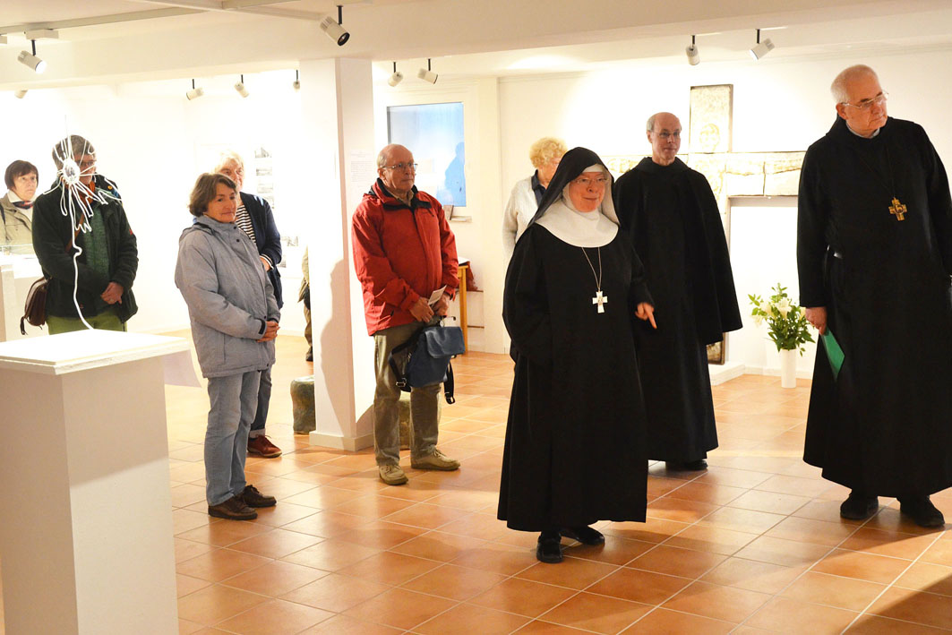 Mit der Ausstellung “ … auf den Weg gestellt“ versuchen die Künstlerinnen Benita Joswig + und Maria Theresia von Fürstenberg eine Würdigung und Erinnerung an Abt Adalbert mit künstlerischen Mitteln. Sie zeichnen ein Portrait dieses außergewöhnlichen Benediktinerabtes und nehmen einzelne biografische Stationen in Form von Kleinplastiken in den Blick. Die einzelnen Stationen verstehen sich als Kreuzungspunkte, an welchen Adalbert von Neippergs Lebenseinstellung, sein Glaubensbekenntnis und sein Leben als Mönch und Abt in verräterischen Zeiten zum Ausdruck gebracht werden. Gerade die künstlerische Annäherung an dieses komplexe Leben bietet dabei die Möglichkeit, ein Zeichen zu setzen, das aufrüttelt und unmißverständlich in die heutige Zeit hineinspricht.
