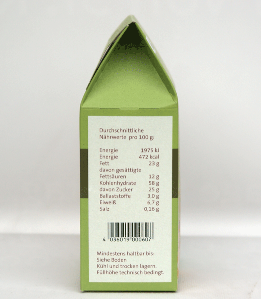 Die Mühle, die für uns die Knusperwaffeln backt, hat daraus den Schluss gezogen, die Grammatur zu verändern. Die Knusperwaffeln werden nicht mehr mit 200 g abgepackt, sondern in den gleichen Tüten nur noch mit 150 g.
