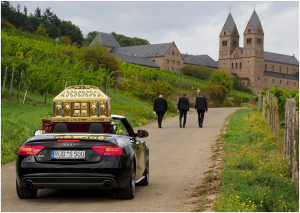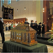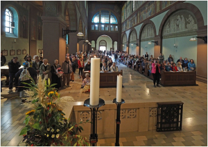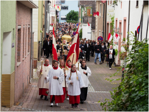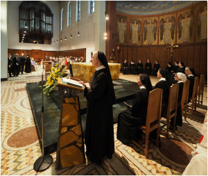 Nach der Reliquienfeier vor der Wallfahrtskirche führte die Prozession durch die Straßen und Weinberge hinauf zur Abtei, wo wir mit zahlreichen Pilgern und Pilgerinnen, denen wir auch unser Chorgestühl öffneten, die Vesper sangen.