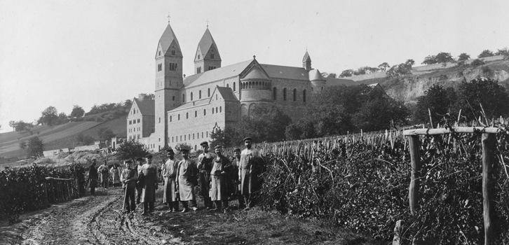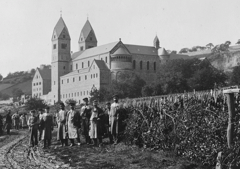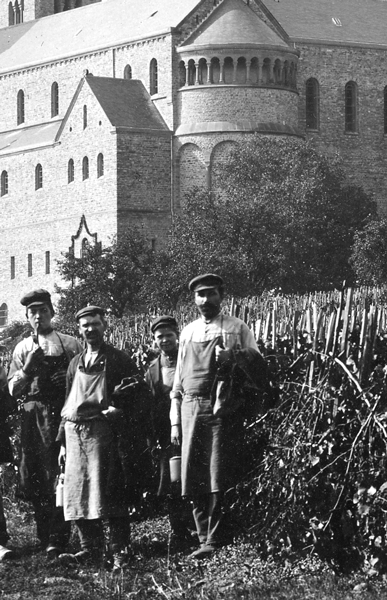 Herr Schäfer, eingeführt in der 4. Woche, besucht zusammen mit dem Bürgermeister von Eibingen, Theodorus Weis (1898–1906), die Baustelle. Der Bau bzw. die durch den Bau massiv beanspruchten Wege, behindern die Weinbauern. Der Gemeinderat verfügte das Schließen der Weinberge durch eine amtliche Verfügung. Maßstab war der Reifegrad der Trauben. Der Beschluss wurde öffentlich verkündet. Damit wurde gewährleistet, dass reife Trauben gelesen wurden. Da niemand die Weinberge betreten durfte, war das Schließen der Weinberge auch ein Schutz vor Diebstahl. Da die Abtei mitten in die Weinberge gebaut wurde, bezeugen frühe Bilder des Klosters weitere Einzelheiten: Die Weinstöcke wurden früher nicht in Reihen erzogen, sondern an Einzelstickeln angebunden.